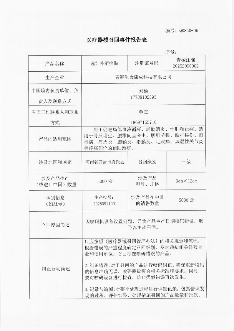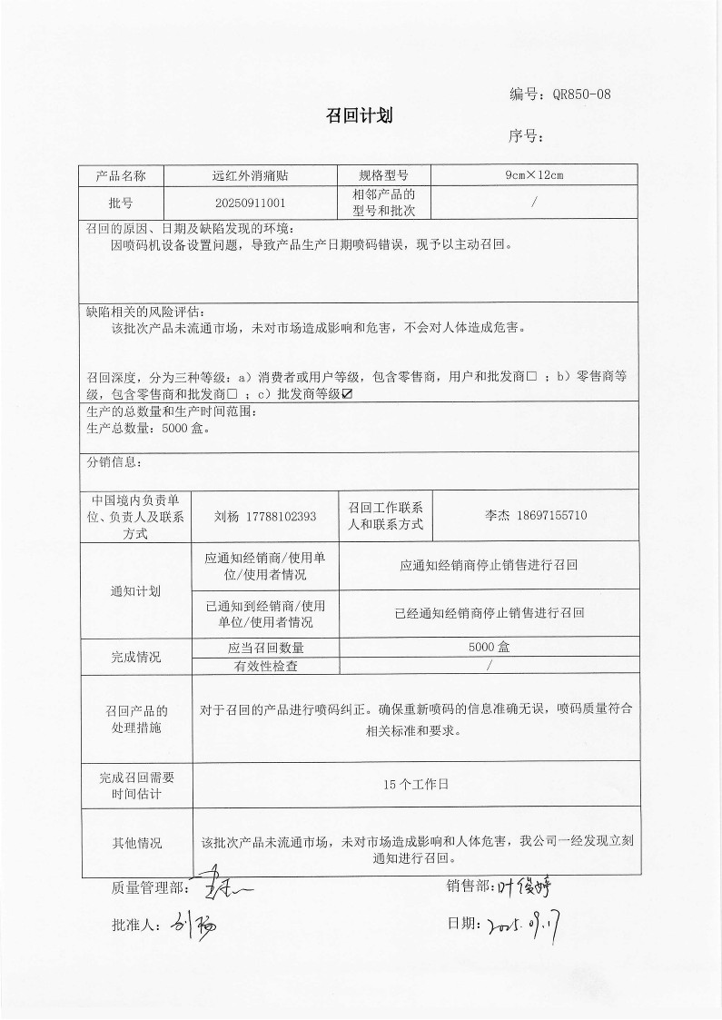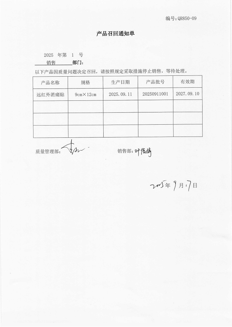 关于对藏老祖牌远红外消痛贴实施主动召回的通知